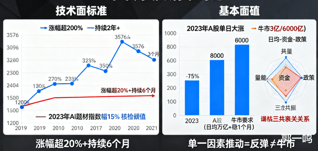 第一个是技术面标准:指数涨幅得超20%,而且得持续6个月以上。拿 2019-2021 年那波举例,创业板指从1200点涨到3576点,涨幅超200%,还持续了两年多,这才是真牛市;反观2023年AI题材那波,指数只涨了15%,撑了3个月就回调了,根本够不上这个标准。