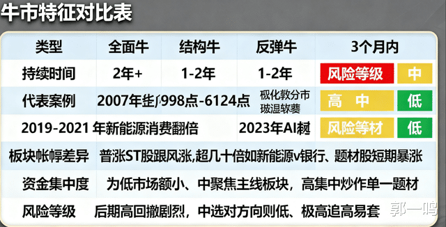 第三种是“反弹牛”,来得快去得也快,比如2023年AI题材炒了一波,没等大家反应过来就结束了,这种行情风险最高,很容易追在高位。