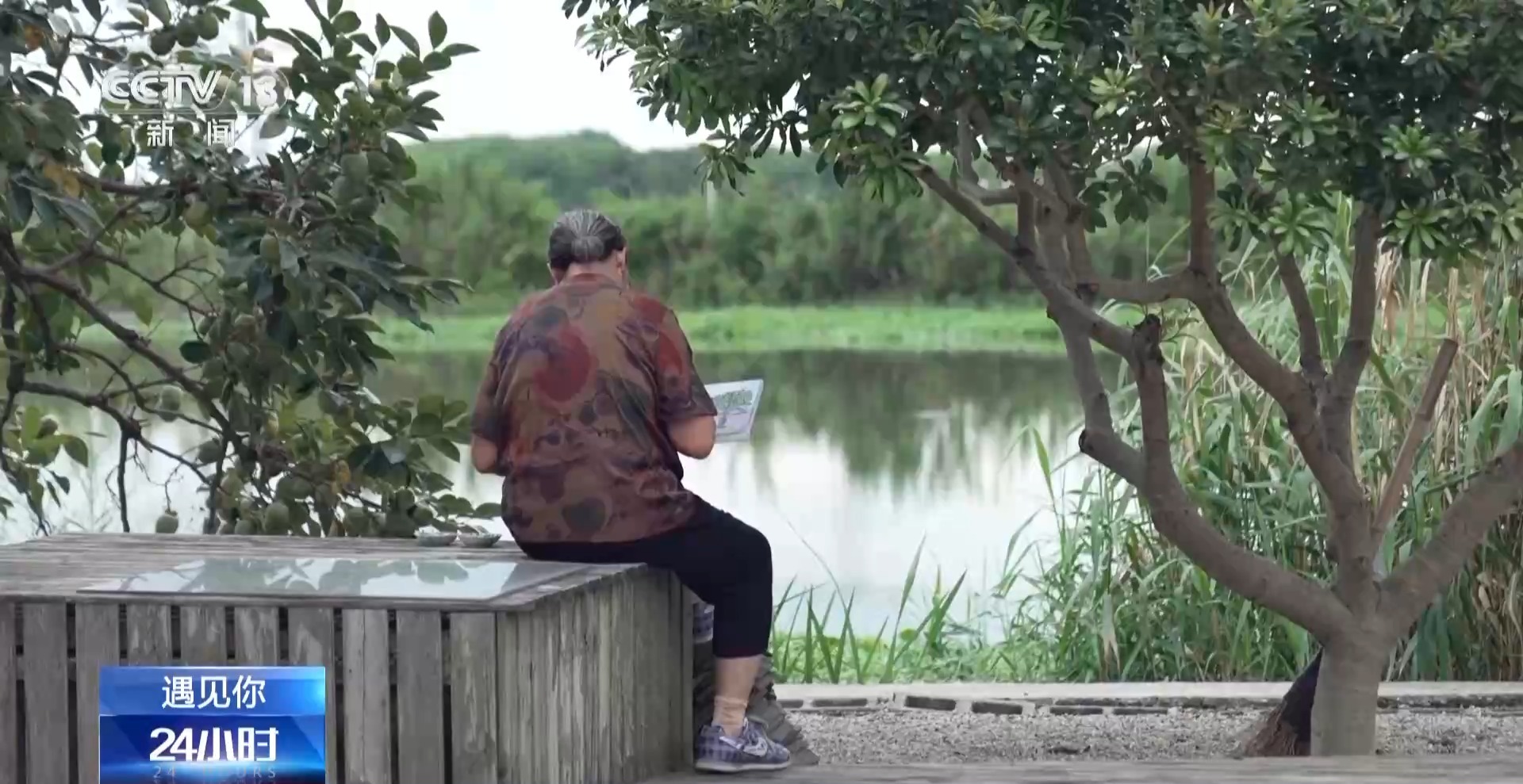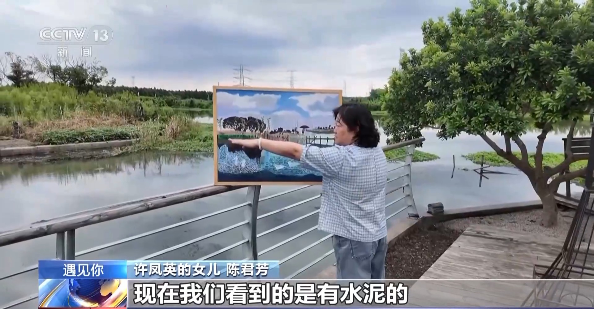 许凤英的女儿 陈君芳:你看河面跟这个是完全不一样的,现在我们看到的是有水泥的,已经是河岸整治过了。当时她画的时候,这边还是原来的那些风貌,也通过这幅画记录了以前的一些风貌。