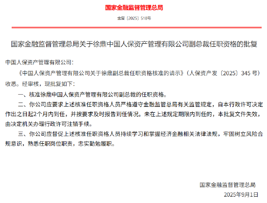 9月15日金融一线消息财富家,国家金融监督管理总局近日发布关于徐鼎中国人保资产管理有限公司副总裁任职资格的批复,核准徐鼎中国人保资产管理有限公司副总裁的任职资格。