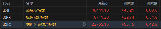 截至收盘,道琼斯指数涨0.09%,报46441.10点,连两日创新高;标普500指数涨0.34%,报6711.20点,刷新了9月22日录得的纪录;纳斯达克综合指数涨0.42%,报22755.16点。